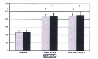 Fig.1. Indice de dommage chez les sujets exposés (applicateurs et non-applicateurs) et les sujets témoins à l’aide de l’essai Comet et de l’analyse de l’indice de dommage. DICA, damage Index Comet assay, * P < 0.0001 (ANOVA). DIRA, damage Index repair assay, • P < 0.0001