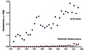 Graphique n°5 : Distribution annuelle de l’incidence des MCM avec dysfonctionnement thyroïdien pendant la grossesse et MCM totaux3