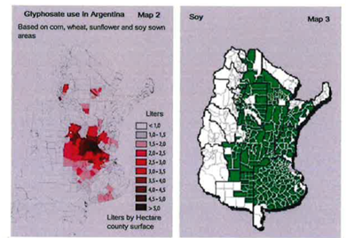 Un autre témoignage pertinent a été apporté par le Dr Hugo Gomez Demaio, un chirurgien pédiatrique spécialisé en neurochirurgie à Cleveland (États-Unis). Il est le chef de l’unité de pédiatrie de l’hôpital de Posadas, Misiones, le seul hôpital public de la province à disposer d’un service de chirurgie pédiatrique. Tous les enfants ayant besoin de ce service sont dirigés vers cet hôpital. Le Centre latino-américain d’enregistrement des malformations congénitales (ECLAM, Centro Latinoamericano de Registro de Malformaciones Congenitas) rapporte que la province de Misiones a un taux de 0,1 /1000 naissances vivantes avec des malformations du tube neural ; mais le Dr Demaio a enregistré dans son hôpital un taux de 7,2/1000 (70 fois plus), qui augmente chaque année. Son équipe a géolocalisé l’origine de ces familles présentant des déficiences graves et invalidantes et toutes les familles proviennent de zones fortement fumigées. Un scénario similaire est observé dans les cas de cancer de l’enfant à Misiones.