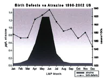 Winchester23 a réalisé une étude épidémiologique-écologique établissant une relation entre la quantité de produits agrochimiques (herbicide Atrazine, nitrates et autres pesticides) mesurée dans les eaux de surface, et les taux de malformations congénitales détectées sur une population de 3 011 000 naissances aux États-Unis, entre 1996 et 2002. Les naissances ont été regroupées selon les mois de conception de l’enfant, en prenant la date de la dernière menstruation (LMP) pour évaluer la période embryonnaire (celle de la plus grande vulnérabilité). Les auteurs ont considéré la présence de pesticides dans les eaux de surface comme un indicateur important des niveaux d’exposition humaine aux pesticides.