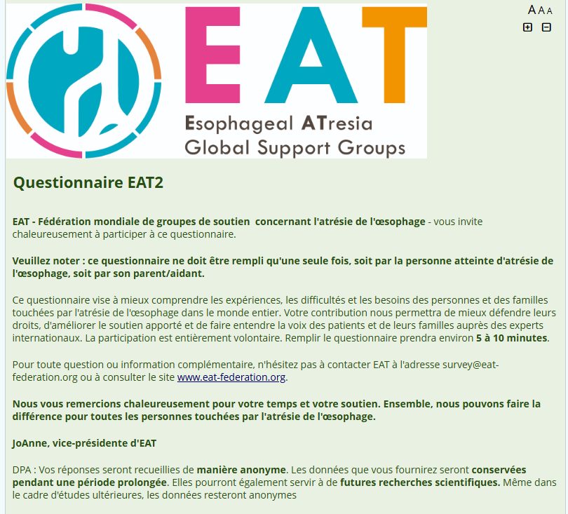 L’EAT – Groupe de support international de l’Atrésie de l’Oesophage – lance une enquête sur les familles touchées par l’atrésie de l’oesophage.